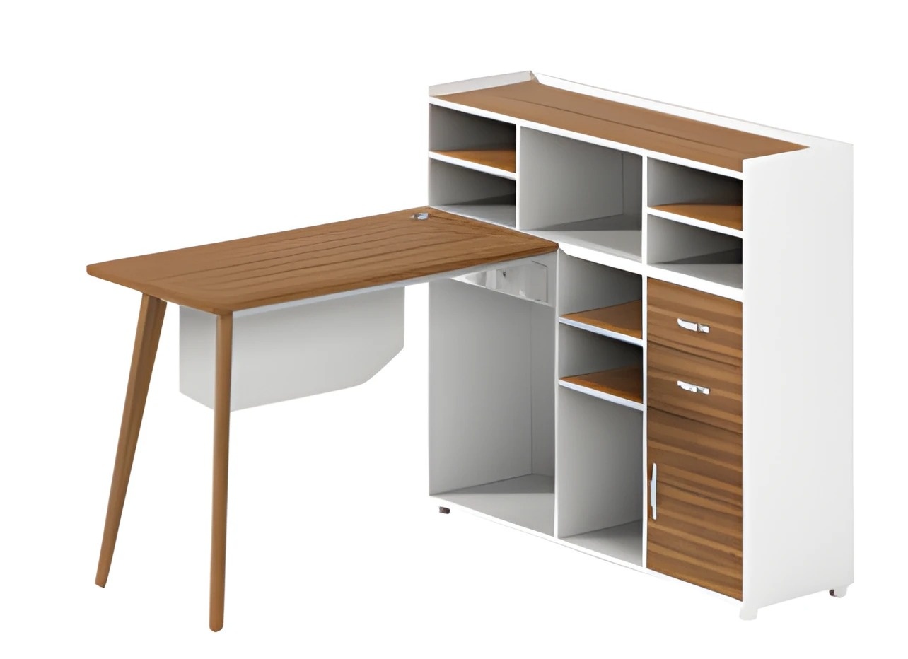 Stůl z dřeva s bílým úložným prostorem, otevřenými přihrádkami a elegantními nohami