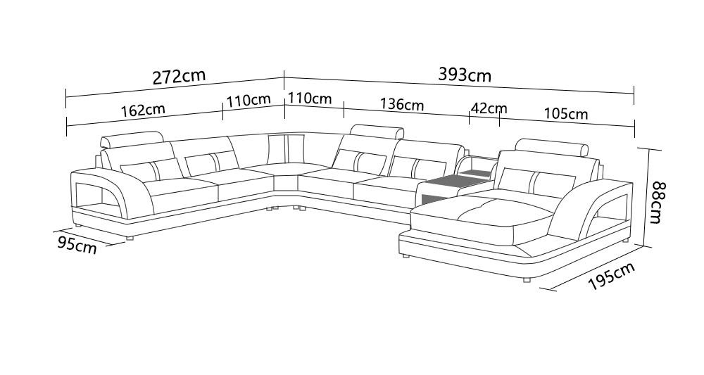 Erleben Sie den Luxus und Komfort eines maßgefertigten U-förmigen Ecksofas aus Premium Lederfaserstoff! Mit XL Möbel haben Sie die Möglichkeit, aus einer vielfältigen Auswahl an Farben wie Türkisblau, Korallenrot, Smaragdgrün und vielen mehr zu wählen. Dieses Eckgarnitur Ledersofa ist in zwei verschiedenen Größen erhältlich und bietet Ihnen mit einer Sitztiefe von ca. 58 cm und einer Sitzhöhe von ca. 42 cm pure Entspannung. Dank des hochwertigen Materials (70% Leder / 30% Polyester) und des Innengestells aus echtem Holz erleben Sie Langlebigkeit und Stabilität. Optional können Sie Ihr Luxus Wohnlandschaft mit einer elektrischen Relax-Fußstütze, einem Soundsystem über Bluetooth oder sogar einer Unterbodenbeleuchtung mit Farbwechsel aufwerten. Mit XL Möbel haben Sie die Möglichkeit, Ihr Ecksofa Ihren individuellen Vorstellungen anzupassen. Gönnen Sie sich ein Stück Luxus für Ihr Zuhause!
