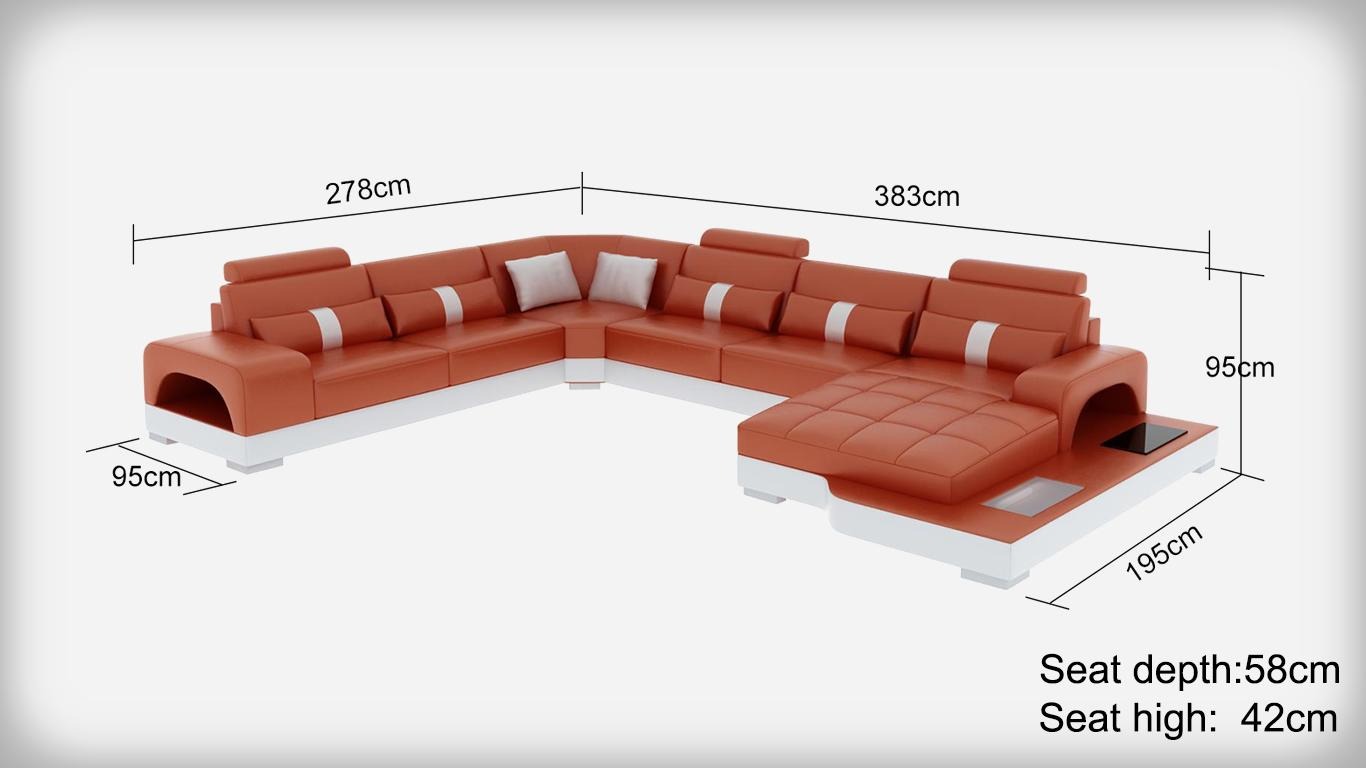 Erleben Sie ultimativen Luxus und Komfort mit unserer maßgefertigten U-förmigen Eckgarnitur "Design Luxus Wohnlandschaft". Hergestellt aus Premium Lederfaserstoff mit einer Mischung aus Leder und Polyester, bietet dieses Ecksofa nicht nur Stil, sondern auch Langlebigkeit. Wählen Sie aus einer Vielzahl von Farbtönen wie Türkisblau, Mahagoni, Gold und vielen mehr, um das Sofa an Ihren persönlichen Geschmack anzupassen. Mit großzügigen Maßen von ca. 278 x 383 x 195 cm oder ca. 195 x 383 x 278 cm bietet diese Eckcouch viel Platz zum Entspannen. Die eingebaute Sitzhöhe von ca. 42 cm und die Tiefe von ca. 95 cm sorgen für den optimalen Komfort. Zudem verfügt das Sofa über 3 USB-Anschlüsse, die Ihnen praktische Lademöglichkeiten bieten. Personalisieren Sie Ihr Sofa weiter, indem Sie zwischen verschiedenen Materialien wie Premium Echtleder, Textilstoff oder Vollleder wählen. Darüber hinaus können Sie optionale Upgrades wie eine elektrische Relax-Fußstütze, ein Soundsystem über Bluetooth oder eine Unterbodenbeleuchtung mit Fernbedienung hinzufügen, um Ihre Wohnlandschaft zu optimieren. Entdecken Sie noch heute die unendlichen Möglichkeiten, die unsere Eckgarnitur "Design Luxus Wohnlandschaft" bietet, und verwandeln Sie Ihr Wohnzimmer in eine stilvolle und bequeme Oase.