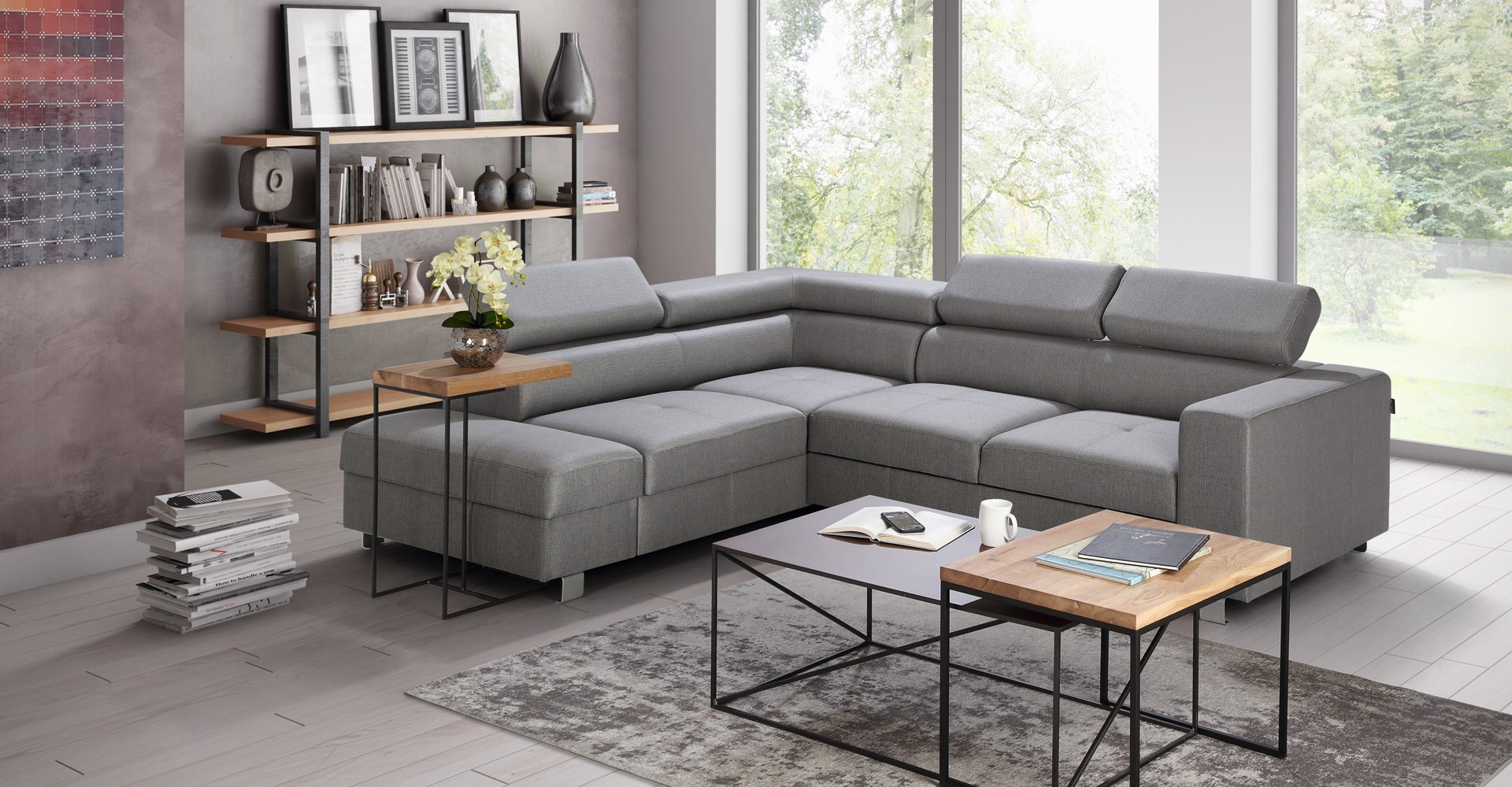 Šedý rohový gauč s funkcí postele, moderní design ve tvaru L | xlmoebel.at