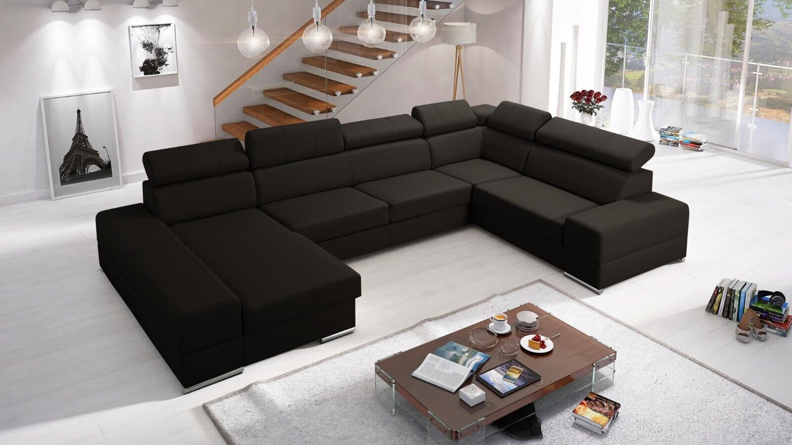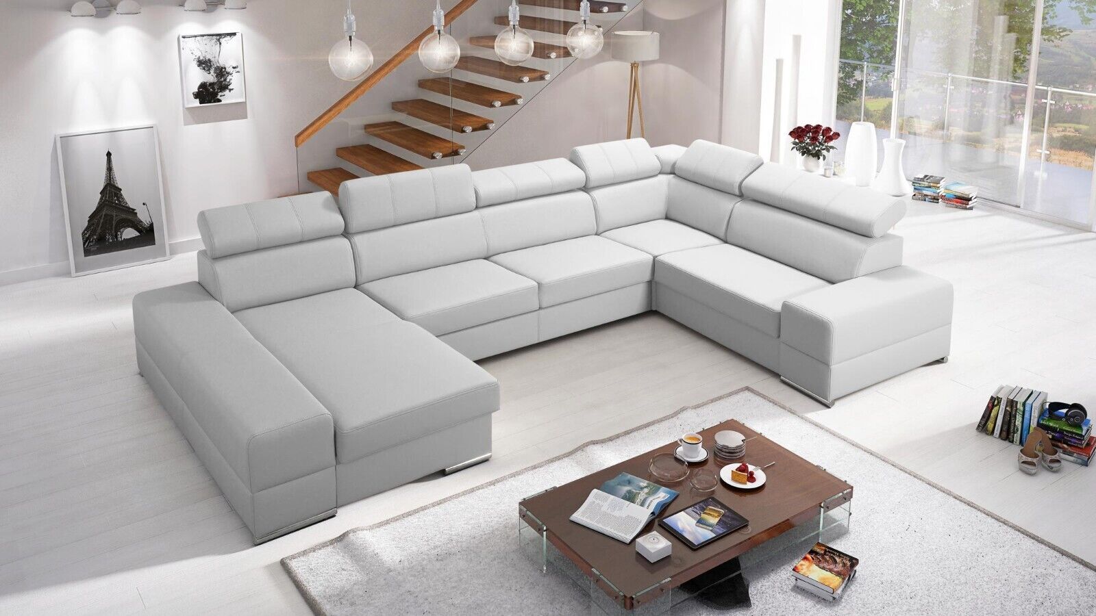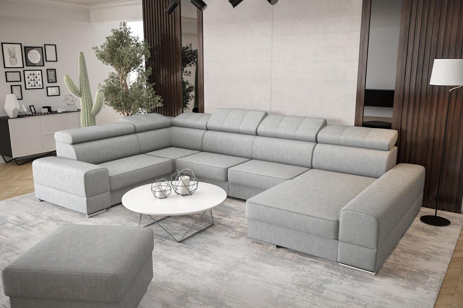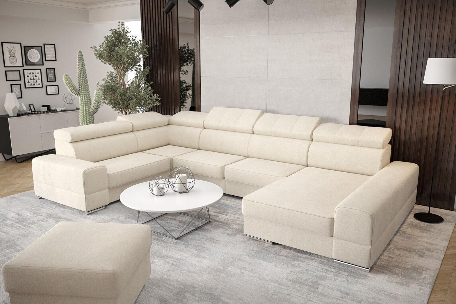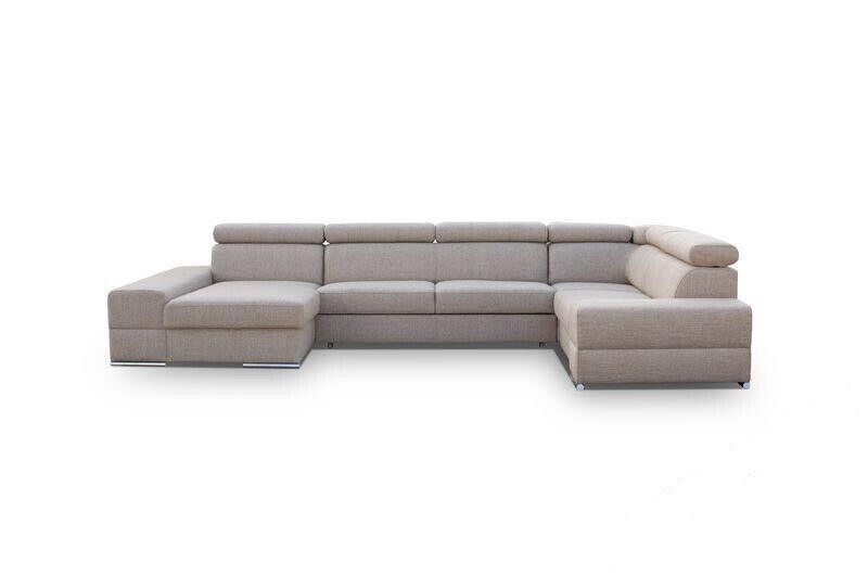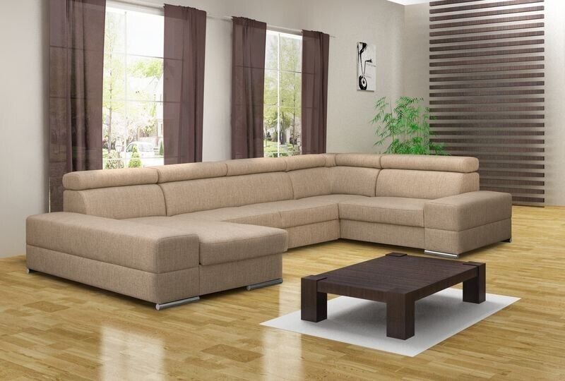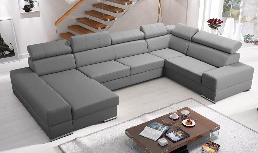 Entdecken Sie den Luxus und Komfort des maßgefertigten U-förmigen Ledersofas von XL Möbel. Dieses moderne Polstermöbelstück für das Wohnzimmer besticht durch sein elegantes Design und seine hochwertige Verarbeitung. Mit einer Größe von ca. 375 x 230/185 x 82/98 cm bietet dieses Ecksofa viel Platz zum Entspannen und Genießen. Die Sitztiefe von ca. 62 cm und die Sitzhöhe von ca. 42 cm sorgen für optimalen Komfort. Sie haben die freie Farbwahl aus einer Vielzahl von Farbtönen, darunter Türkisblau, Lavendelblau, Smaragdgrün, Korallenrot und vielen mehr. Das Material können Sie ebenfalls frei wählen, von Stoff über Premium Kunstleder bis hin zu einer Kombination aus beiden. Zur Ausstattung gehören ein Bettkasten sowie die Option einer Unterboden LED Beleuchtung gegen Aufpreis. Das Ecksofa verfügt über ein stabiles Innengestell aus echtem Holz mit Federkern für zusätzlichen Komfort. Erleben Sie exklusives Design und höchsten Komfort mit diesem modernen Ledersofa für Ihr Wohnzimmer. Gönnen Sie sich ein Stück Luxus und entspannen Sie in Ihrem neuen Lieblingsmöbelstück.