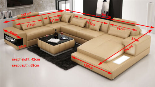 Entspannen Sie in Stil und Komfort mit unserer U-förmigen Ledersofa Wohnlandschaft! Dieses Ecksofa bietet nicht nur ausreichend Platz, sondern auch die Möglichkeit, es nach Ihren Wünschen anzupassen. Wählen Sie aus einer Vielzahl von Farben wie Türkisblau, Smaragdgrün, Korallenrot und vielen mehr. Hergestellt aus hochwertigem Premium Lederfaserstoff (70% Leder / 30% Polyester) garantiert dieses Sofa Langlebigkeit und Komfort. Optional sind auch andere Materialien wie echtes Premium Echtleder oder Premium Textilstoff verfügbar. Mit Maßen von ca. 287 x 367 x 190 cm oder 190 x 367 x 287 cm und einer Sitztiefe von ca. 59 cm bietet dieses Sofa genügend Platz für gemütliche Abende zuhause. Lassen Sie sich dieses exklusive Design nicht entgehen und machen Sie Ihr Wohnzimmer zu einem Ort der Entspannung.