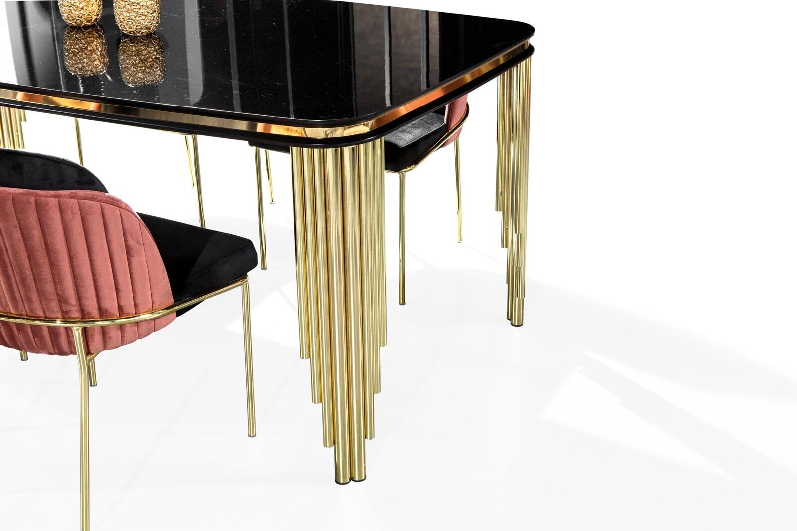Entdecken Sie die Moderne Esszimmermöbel Essgruppe! Diese stilvolle Esstisch- und Stuhlset in Schwarz aus hochwertigem Edelstahl wird Ihr Esszimmer in einen eleganten Raum verwandeln. Der Esstisch misst ca. 200 x 90 x 82 cm, während die 4 Stühle jeweils ca. 52 x 56 x 90 cm groß sind. Hergestellt aus Holz sind diese Möbel nicht nur robust, sondern auch ein Blickfang in jedem Raum. Bestellen Sie jetzt und verleihen Sie Ihrem Esszimmer einen Hauch von Luxus!