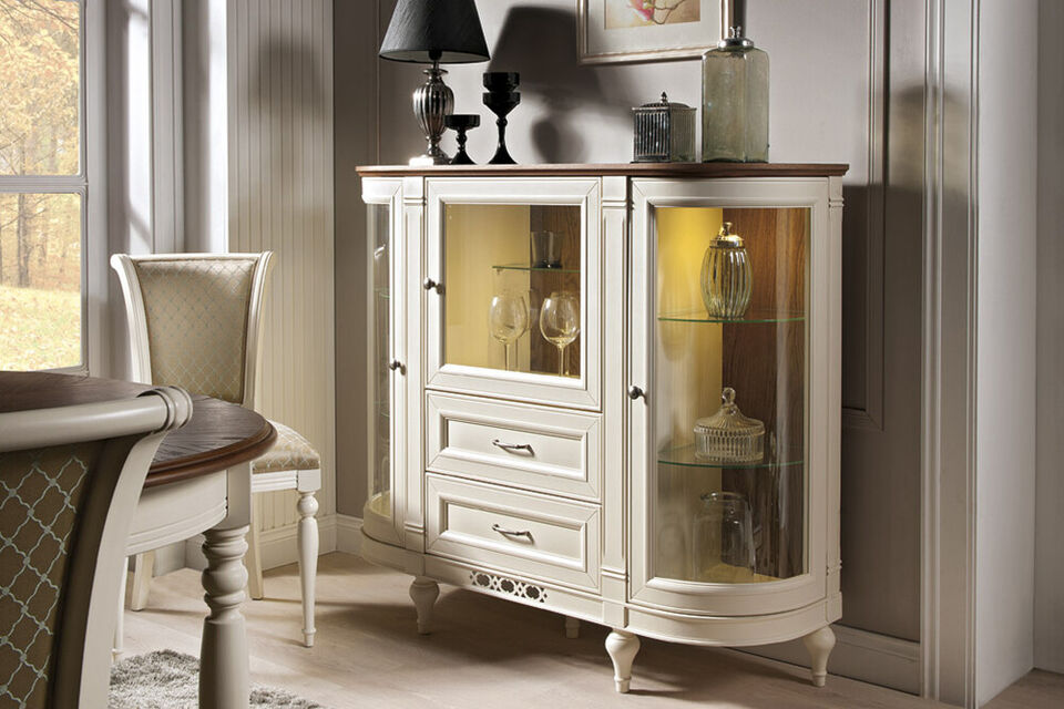 Entdecken Sie die zeitlose Eleganz der klassischen Kommode Vitrine von XL Möbel! Diese Kommoden Vitrinenschrank Kombination vereint Funktionalität mit einem Hauch von Luxus und eignet sich perfekt für Ihr Esszimmer. Hergestellt aus lackiertem Massivholz und MDF (Mitteldichte Holzfaserplatte) bieten diese Möbelstücke nicht nur Stil, sondern auch Langlebigkeit. Die Maße der Kommode Vitrine betragen 970 mm Höhe, 394 mm Tiefe und 1699 mm Breite. Außerdem können Sie aus einer Vielzahl von Farben wählen, um sicherzustellen, dass sie perfekt zu Ihrer Einrichtung passen. Der Lieferzustand ist teil-montiert, was die Aufstellung erleichtert. Genießen Sie die Vielfalt klassischer Esszimmermöbel von XL Möbel und holen Sie sich jetzt diese exquisite Kommode Vitrine für Ihr Zuhause!