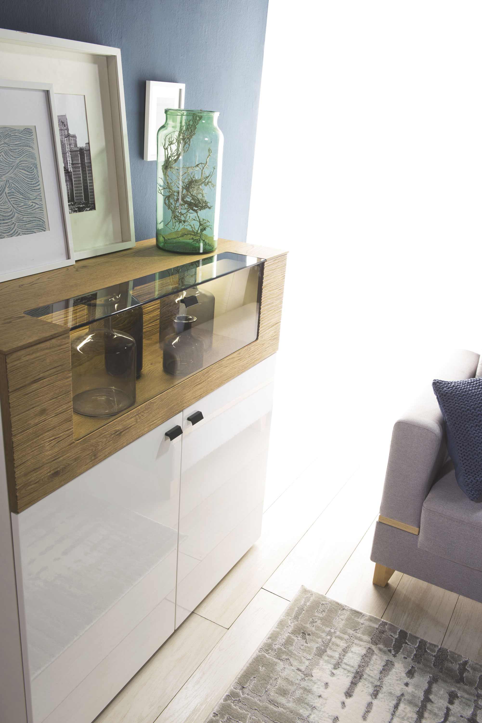 Rückwand & Einlegeböden: MDF (Mitteldichte Holzfaserplatte), furniert & lackiert