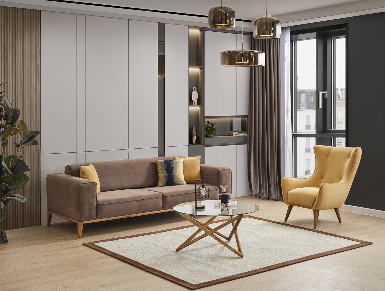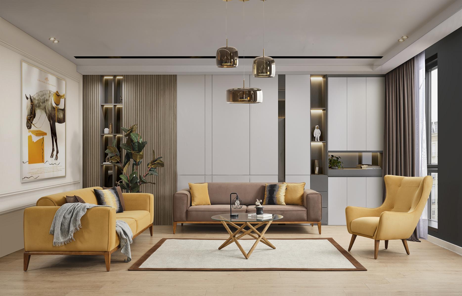 Entspannen Sie stilvoll mit unserer modernen Sofagarnitur in Gelb! Dieses Viersitzer-Sofa und Sessel-Set ist der perfekte Blickfang für Ihr Wohnzimmer. Mit seinem zeitgemäßen Design und den Maßen von ca. 260 cm Länge, 100 cm Breite und 80 cm Höhe für das Sofa und ca. 75 cm Länge, 80 cm Breite und 96 cm Höhe für den Sessel bietet es ausreichend Platz für gemütliche Abende. Hergestellt aus hochwertigem Holz und Stoff, ist dieses Set nicht nur einladend bequem, sondern auch langlebig. Entdecken Sie jetzt die gelbe Sofagarnitur und verleihen Sie Ihrem Zuhause eine frische Note! Einfach anfragen, wenn Sie andere Farben wünschen.
