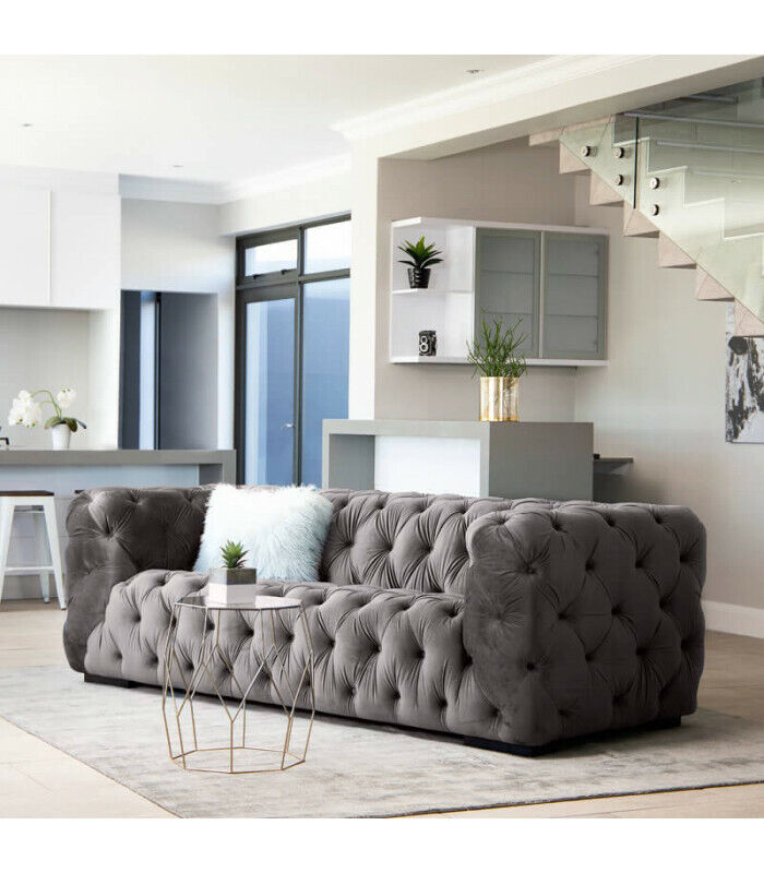 Grauer Chesterfield Dreisitzer Couch Gepolsterter Stil Möbel