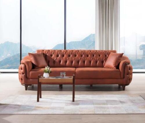 Orange Chesterfield Couch Dreisitzer Sofa Möbel Samt Holz Sitzpolster