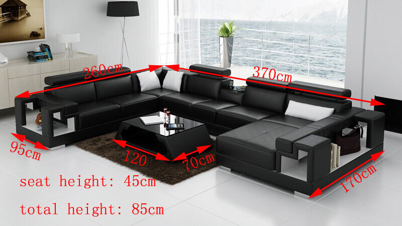 Erleben Sie den Luxus und die Eleganz unserer maßgefertigten U-förmigen Eckcouch! Die Wohnlandschaft bietet nicht nur erstklassigen Komfort, sondern auch eine Vielzahl von Farboptionen, darunter Türkisblau, Korallenrot, Smaragdgrün und mehr. Hergestellt aus Premium Lederfaserstoff (70% Leder / 30% Polyester) und optional in verschiedenen Stoffen erhältlich, können Sie das Sofa ganz nach Ihren Wünschen gestalten. Das Innengestell aus echtem Holz sorgt für Stabilität und Langlebigkeit. Die Maße der Couch betragen ca. 260 x 370 x 170 cm oder 170 x 370 x 260 cm, mit einer Höhe von ca. 85 cm und einer Sitztiefe von ca. 59 cm. Der Couchtisch misst ca. 120 x 70 cm. Für einen Aufpreis können Sie auch zwischen Premium Echtleder, Textilstoff oder Vollleder wählen. Lassen Sie sich von XL Möbel verwöhnen und passen Sie Farbe und Größe nach Ihren individuellen Vorstellungen an. Gönnen Sie sich dieses exklusive Möbelstück!