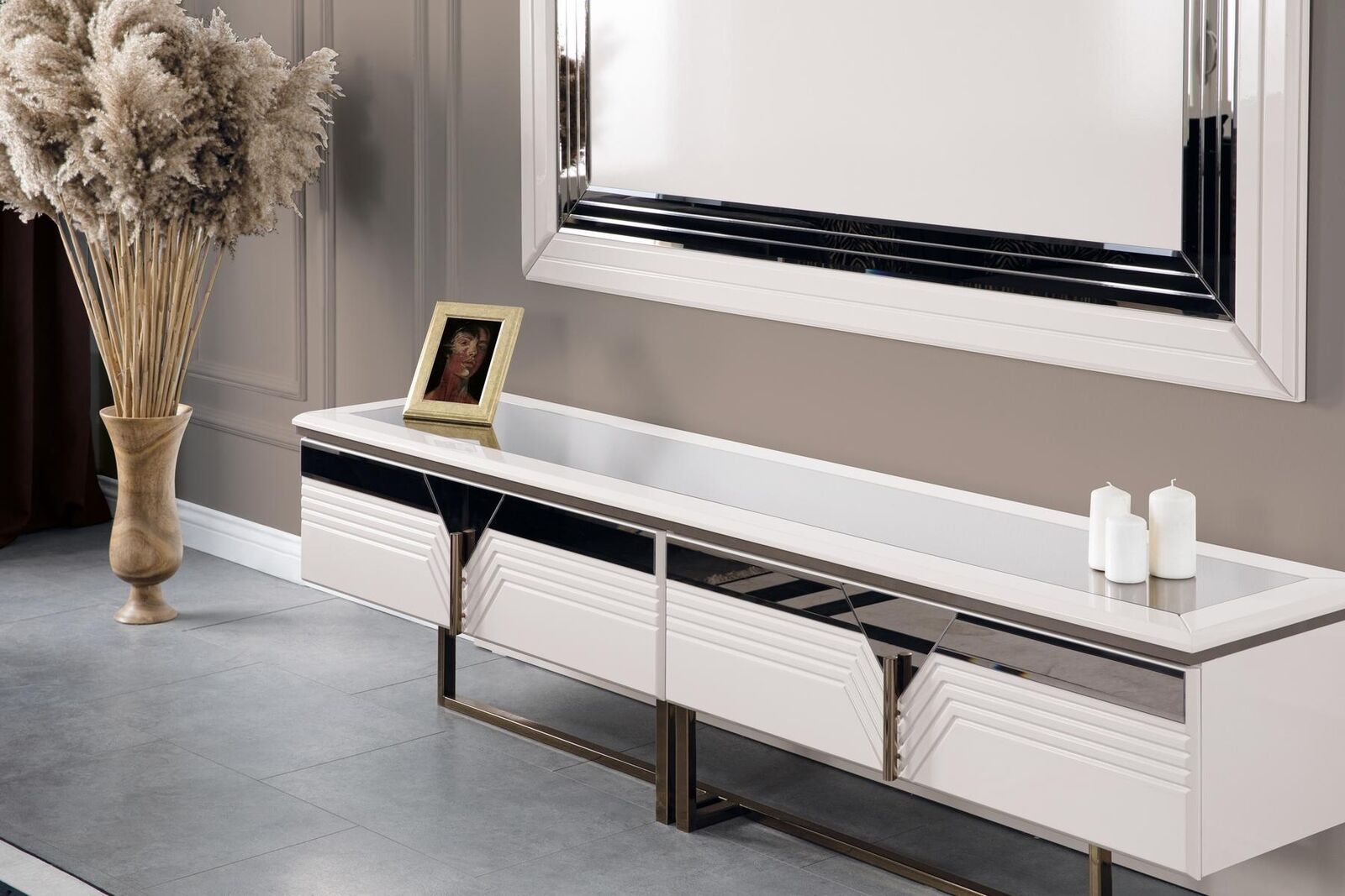 Verschönern Sie Ihr Wohnzimmer mit der Wohnwand TV Ständer Wandpanel RTV Lowboard in Weiß! Dieses moderne Sideboard von XL Möbel hat alles, was Sie brauchen, um Ihre Unterhaltungselektronik stilvoll zu präsentieren. Das Set besteht aus einem TV Schrank mit den Maßen ca. 210 cm x 46 cm x 53 cm und einem Wandpanel von ca. 180 cm x 5 cm x 100 cm. Hergestellt aus hochwertigem Holz, fügt sich dieses Möbelstück perfekt in Ihr Zuhause ein. Entdecken Sie jetzt die ideale Lösung, um Ihr Wohnzimmer zu verschönern und gleichzeitig für Ordnung zu sorgen!